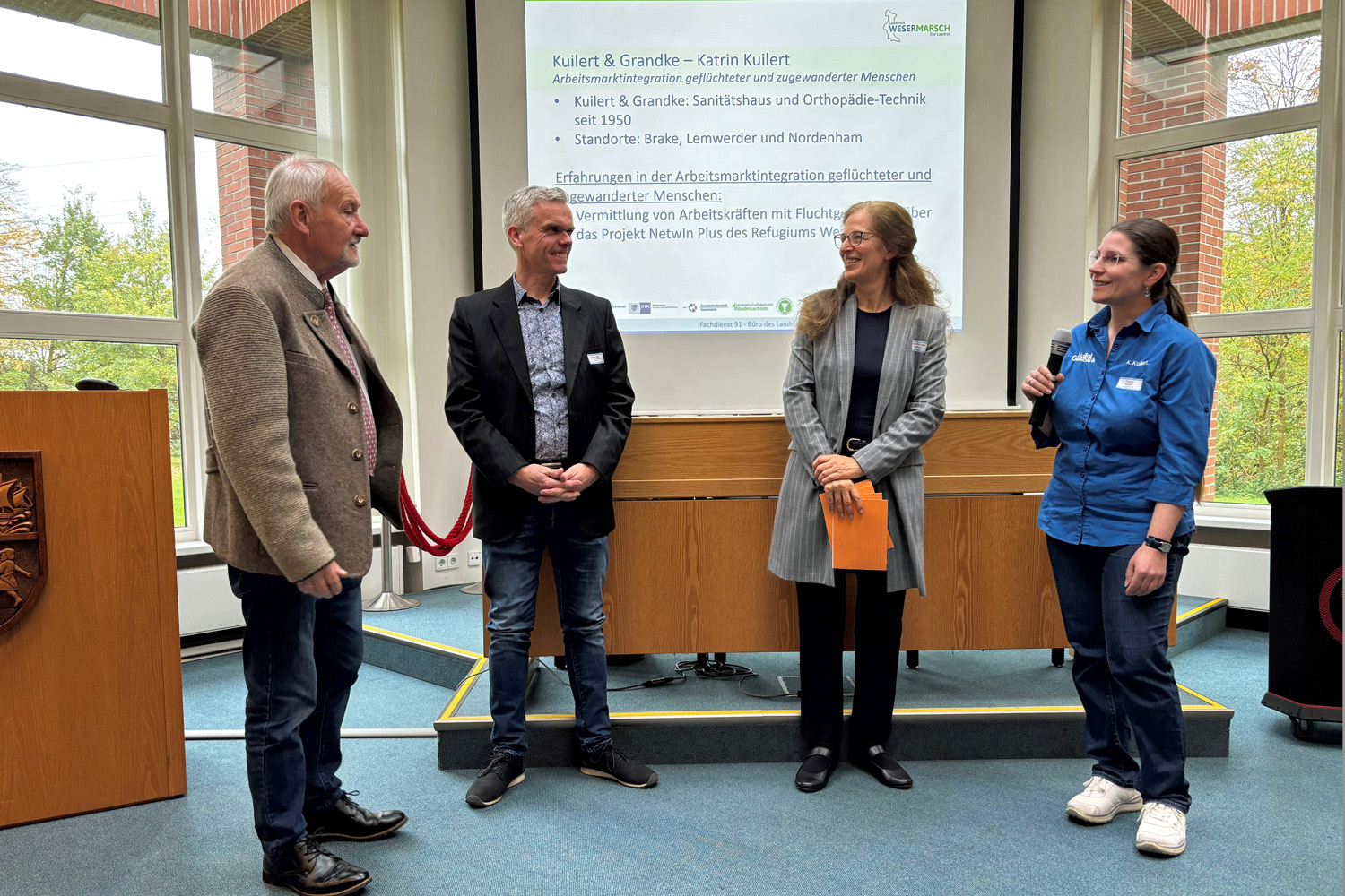 Die deutsche Sprache ist der Schlüssel zur Integration: So lassen sich Redebeiträge von Udo Venema („Butjadinger Tor“ in Abbehausen), Georg Dürr (Herdejürgen & Harmsen Tischlerei in Nordenham) und Katrin Kuilert (Kuilert & Grandke in Brake) in einer Hauptbotschaft zusammenfassen. Vor 70 Teilnehmern berichteten die Unternehmer auf Einladung des Landkreises Wesermarsch von ihren Erfahrungen. Unter der Moderation von Helga Barbara Gundlach zeigten sie Beispiele für gelungene Integration auf. Titel der Veranstaltung in Brake: „Einstellungssache: Migrantische Arbeitskräfte als Chance für Ihr Unternehmen.“