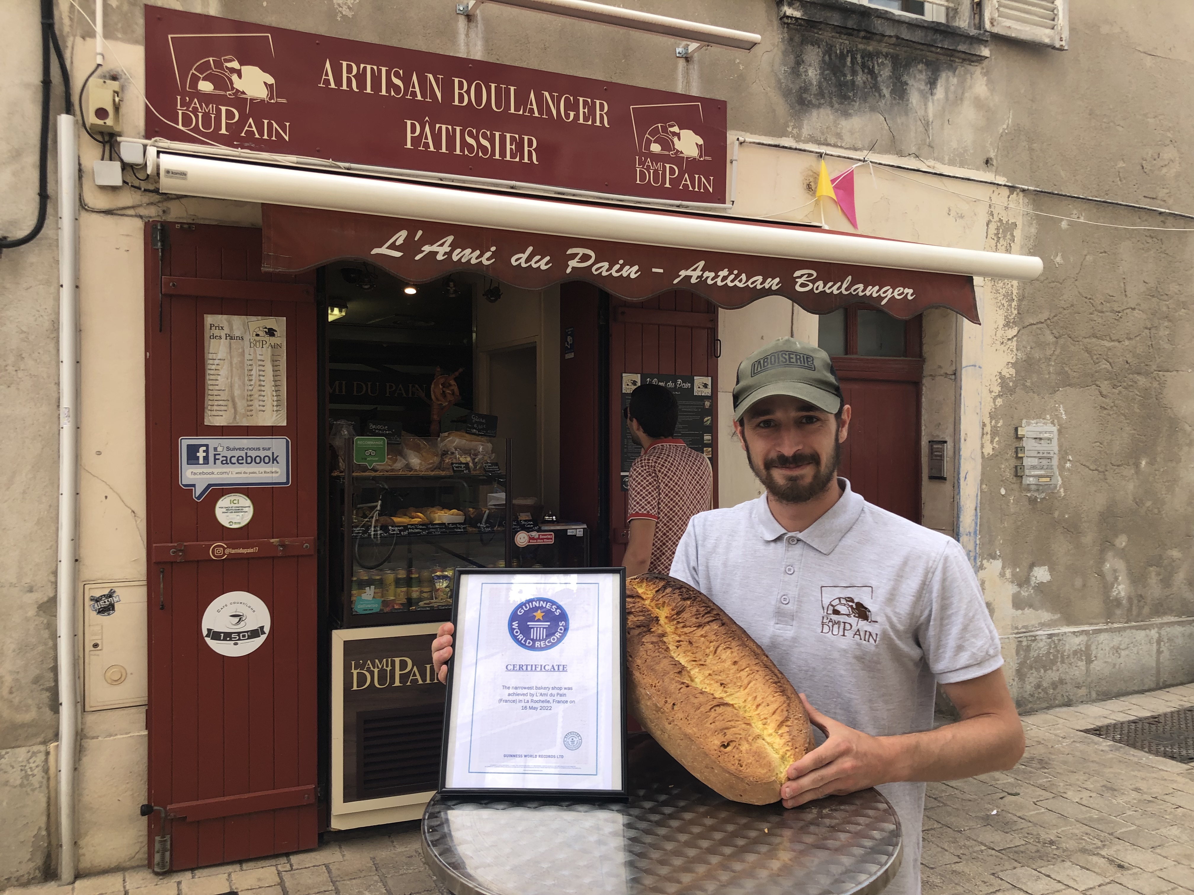 Mini-Fassade, maximaler Gesprächsstoff: Antoine aus La Rochelle zeigt die Guinness-World-Record-Urkunde „Schmalste Bäckerei der Welt“.