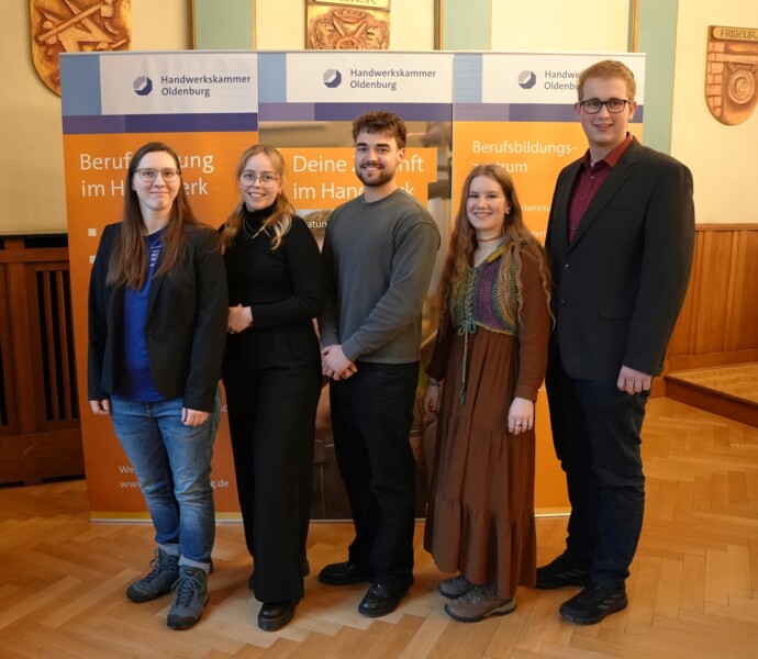 Heiko Henke, Hauptgeschäftsführer der Handwerkskammer Oldenburg (v.l.) gratuliert den Bundessiegerinnen und Bundessiegern Eske Kranich, Amelie Christin Hubert, Finn Willhoff, Feline Alterbaum und Janno Bredehorn, und wurdigt gemeinsam mit Eckhard Stein, Präsident der Handwerkskammer (r.) ihre Leistungen.